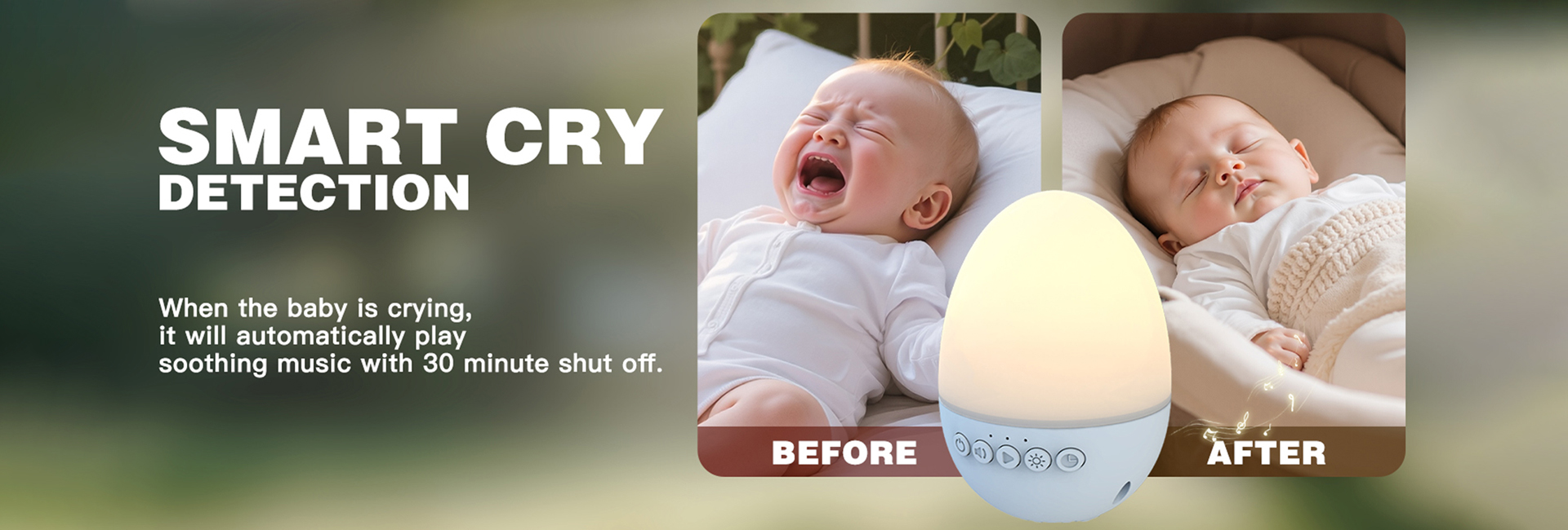 White noise, fan, moderate rain, light rain, thunderstorm, wind, ocean waves, water stream, birds, cricket, frog, fireplace, heartbeat, lullaby, music box, twinkle little star. We can customize the sound that you like.
